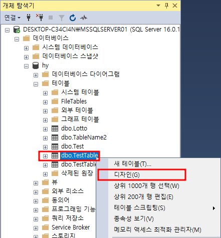 특정 테이블의 정보를 알고 싶다면 테이블에 오른쪽 마우스 클릭 후 디자인을 선택합니다.
