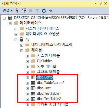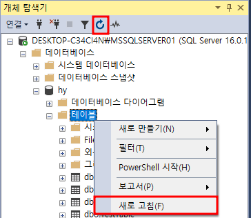 테이블이 생성된 것을 확인하려면 개체 탐색기 상단에 새로고침 버튼을 클릭합니다.