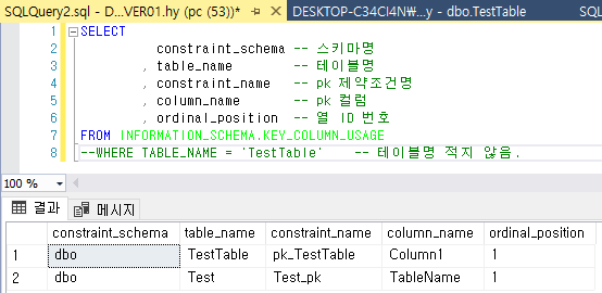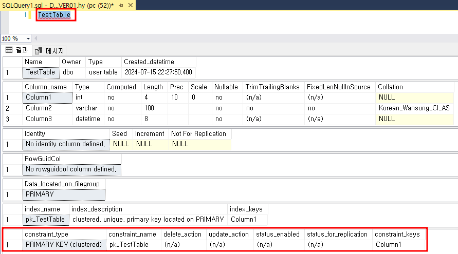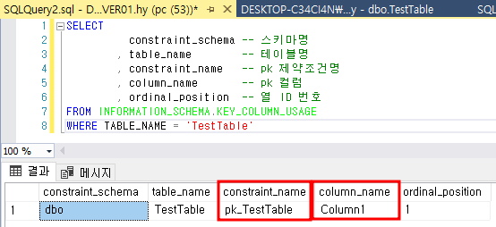 Column1이 PK 컬럼이고 제약조건명은 pk_TestTable인 것을 확인할 수 있습니다.