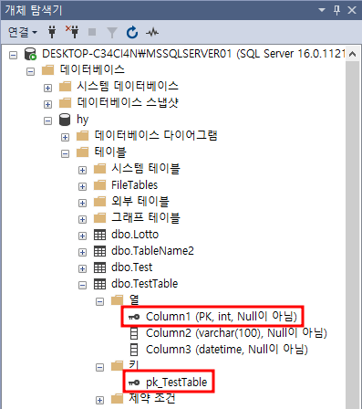 PRIMARY KEY (PK)가 제약조건명은 pk_TestTable이며 PK(기본키) 칼럼은 Column1인 것을 확인할 수 있습니다.